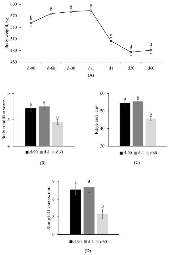 Body weight (A), body condition score (B), ribeye area (C), and rump fat thickness (D) measured throughout the peripartum period of Nellore cows supplemented or not with different levels of dried distillers grains during the last trimester of gestation. There was no treatment effect (p > 0.05) and no interaction between treatment and time (p > 0.05). a, b, c, d Repeated measures over time followed by different letters differ from each other with p < 0.05.