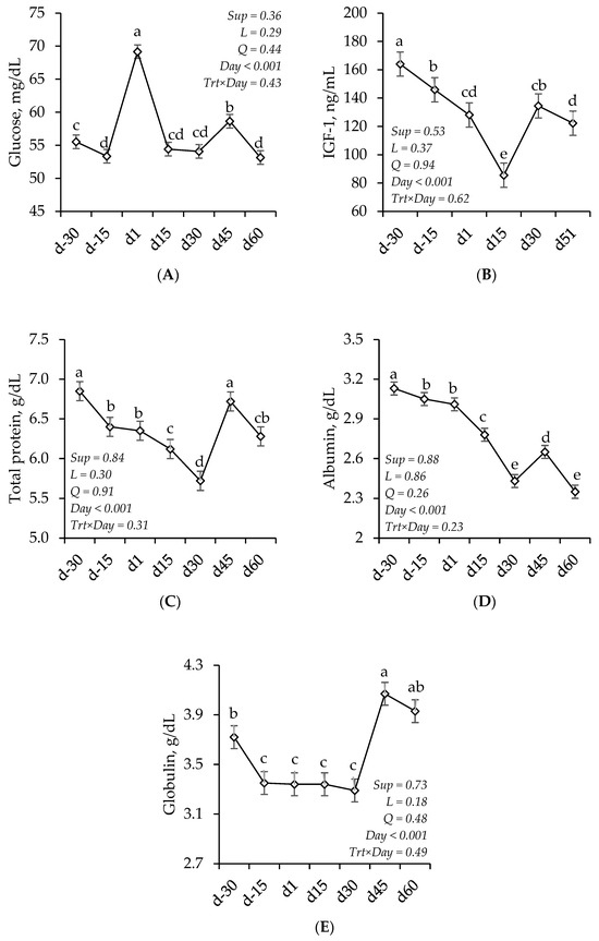 The concentrations of IGF-1, glucose, total proteins, albumin, and globulin were not affected by treatment (p > 0.05) but varied according to collection day (p < 0.001; Figure 2). In general, glucose levels were the highest on d1, followed by d45, and were the lowest on d60. IGF-1 levels decreased from d-30 to d15, then increased from d15 to d30. Total protein and albumin concentrations decreased from d-30 to d30, then increased from d30 to d45. Globulins decreased from d-30 to d-15 and remained at a constant level until d30, when they increased between d30 and d45.