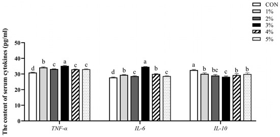 Effect of β-conglycinin on serum cytokine levels of broilers. TNF-α, tumor necrosis factor-alpha; IL-6, interleukin-6; IL-10, interleukin-10. a–d Value columns with different lowercase letters are statistically significantly different (n = 12; p < 0.05).