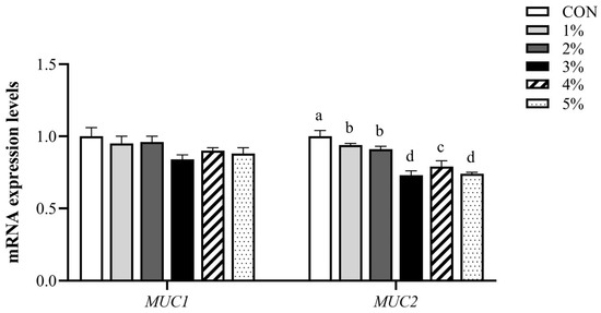 Figure 3 demonstrates that dietary inclusion with different levels of β-conglycinin significantly down-regulated the MUC2 mRNA expression levels compared to the control group, and dietary supplementation with 3% and 5% showed lower expression levels (p < 0.05). However, no significant differences in MUC1 mRNA expression levels were observed between groups (p > 0.05).