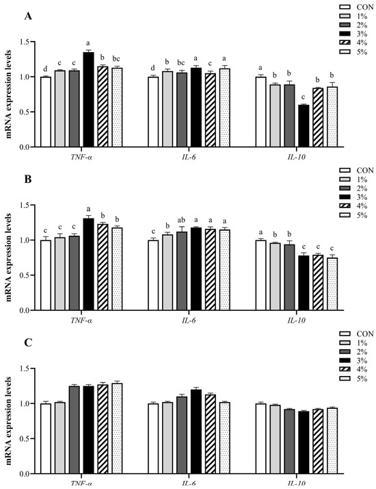 TNF-α, IL-6, and IL-10 mRNA expression levels in the small intestinal mucosa. (A–C) represent the mRNA expression levels of TNF-α, IL-6, and IL-10 in the mucosa of the duodenum, jejunum, and ileum, respectively. TNF-α, tumor necrosis factor-alpha; IL-6, interleukin-6; IL-10, interleukin-10. a–d Value columns with different lowercase letters are statistically significantly different (n = 12; p < 0.05).