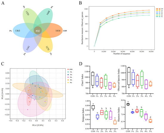 The contents of the cecum, which was kept at −80 °C, were removed and placed in dry ice and sent for testing (Personal Biotechnology, Nanjing, China). Total microbial DNA was extracted from cecal digesta samples using a commercial stool DNA extraction kit (Omega Bio-Tek, Norcross, GA, USA) following the manufacturer’s instructions. The quantity and quality of extracted DNAs were measured using a NanoDrop NC2000 spectrophotometer (Thermo Fisher Scientific, Waltham, MA, USA) and agarose gel electrophoresis, respectively. The PCR amplification of the bacterial 16S rRNA genes’ V3-V4 region was performed using the forward primer 338F (5′-ACTCCTACGGGAGGCAGCA-3′) and the reverse primer 806R (5′-GGACTACHVGGGTWTCTAAT-3′). PCR amplicons were purified with Vazyme VAHTSTM DNA Clean Beads (Vazyme, Nanjing, China) and quantified using the Quant-iT PicoGreen dsDNA Assay Kit (Invitrogen, Carlsbad, CA, USA). After the individual quantification step, amplicons were pooled in equal amounts, and pair-end 2 × 250 bp sequencing was performed using the Illlumina NovaSeq platform with NovaSeq 6000 SP Reagent Kit (500 cycles) at Nanjing Personal Biotechnology Co., Ltd. (Nanjing, China). α-diversity and β-diversity were analyzed on the online platform of Personalbio Genescloud (https://www.genescloud.cn/, accessed on 2 January 2024.).