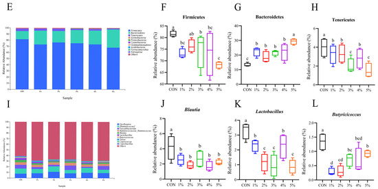 There were 402 shared OTUs and 1414, 1275, 1141, 1363, 1320, and 1448 OTUs unique in the control, 1%, 2%, 3%, 4%, and 5% β-conglycinin groups, respectively. Venn diagrams showed that supplementation with β-conglycinin decreased the number of unique OTUs, meaning that β-conglycinin increased the percentage of shared bacteria (Figure 5A). As shown in Figure 5C, the results of the weighted UniFrac of principal coordinate analysis (PCoA) showed that the 1% and 5% treatment groups were clustered separately from the control group and had two principal coordinates (PCo1 and PCo2) explaining 32.8% and 14.6% of the variation, respectively. As presented in Figure 5D, dietary β-conglycinin addition significantly decreased the Shannon and Simpson indices (p < 0.05). However, the Chao1 and observed species indices had no special differences between groups (p > 0.05).