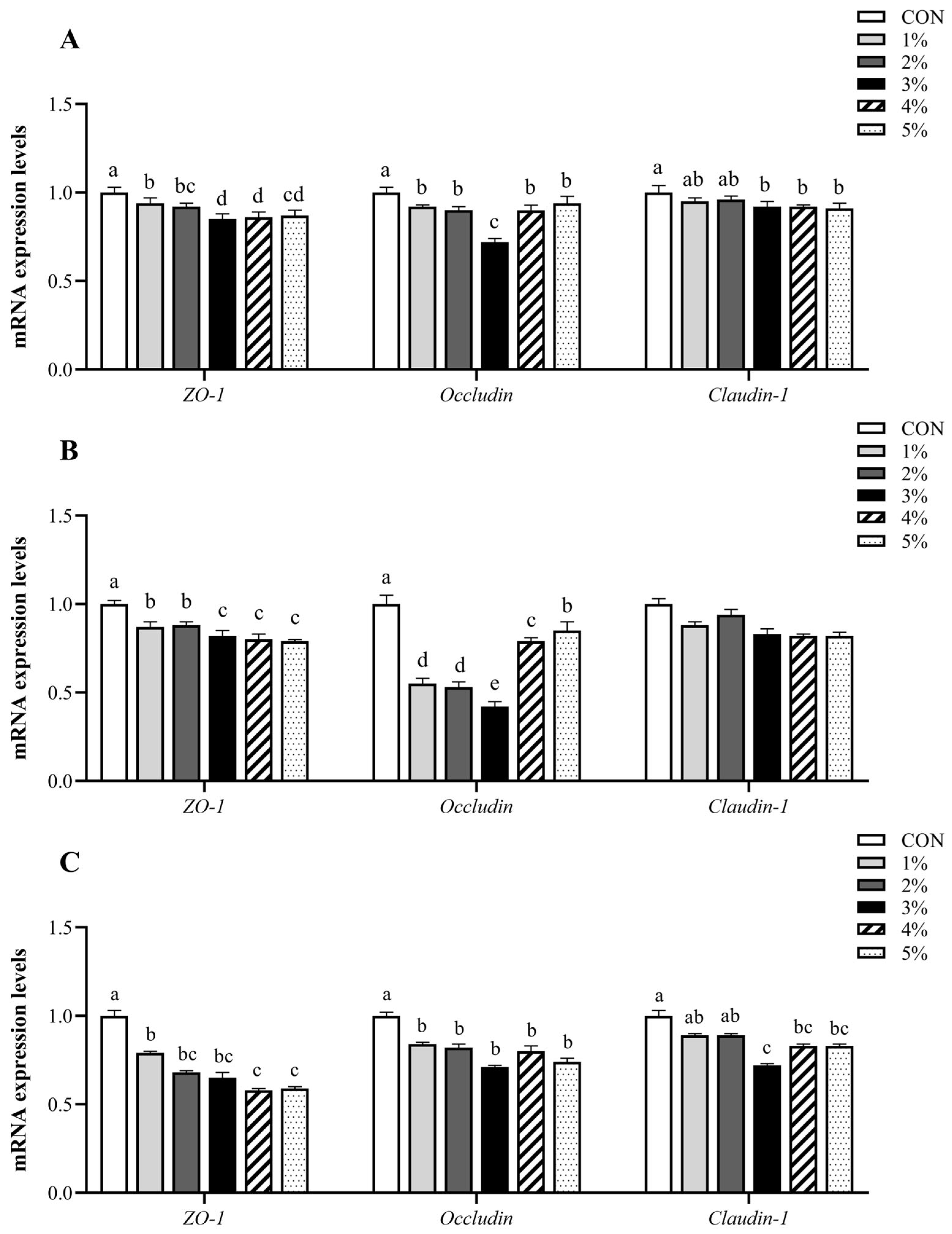 ZO-1, Occludin, and Claudin-1 mRNA expression levels in the small intestinal mucosa. (A–C) present the mRNA expression levels of ZO-1, Occludin, and Claudin-1 in the mucosa of the duodenum, jejunum, and ileum, respectively. ZO-1, Zonula Occludens-1. a–e Value columns with different lowercase letters are statistically significantly different (n = 12; p < 0.05).