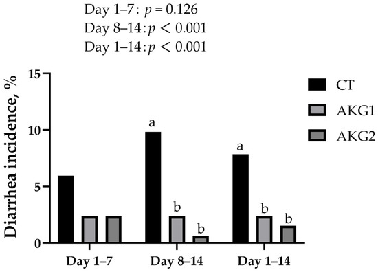 Effects of AKG on the diarrhea incidence of weaned piglets. a,b Values with different superscripts are significantly different (p ≤ 0.05).
