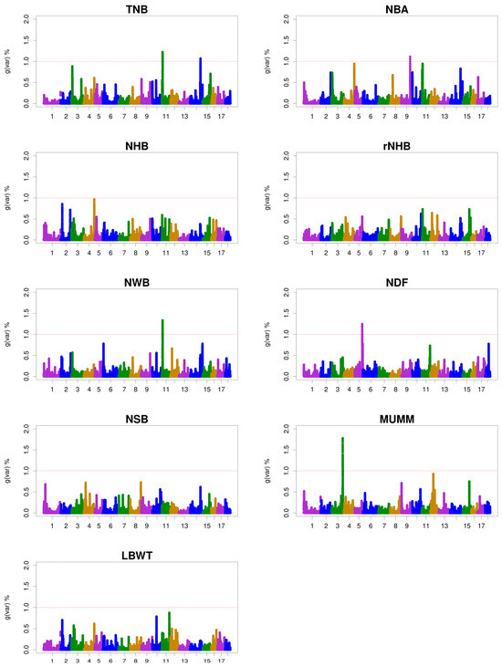 Manhattan plots for the percentage of genetic variance by 0.3 Mb window for litter size traits. gVar (%) represents the proportion of genetic variance explained by the 0.3 Mb window. The horizontal coordinate represents the chromosomes of pigs: total number born (TNB), number of piglets born alive (NBA), number of healthy births (NHB), rate of NHB (rNHB), number of weak births (NWB), number of deform fetus (NDF), number of stillborn (NSB), mummified pigs (MUMM), litter weight at birth (LBWT), and gVar (%) = the proportion of the genetic variance explained by the 0.3 Mb-adjacent SNP window.