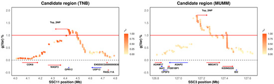 Candidate region plots illustrating the two major candidate regions on SSC11 and SSC3. The results are displayed for the total number born (TNB) at approximately 4.0–4.8 Mb on SSC11 (left) and for mummified pigs (MUMM) at 126.8–127.8 Mb on SSC3 (right). Various levels of linkage disequilibrium between the primary SNP and surrounding SNPs are represented by distinct colors. gVar (%) denotes the proportion of the genetic variance explained by the 0.3 Mb-adjacent SNP window.