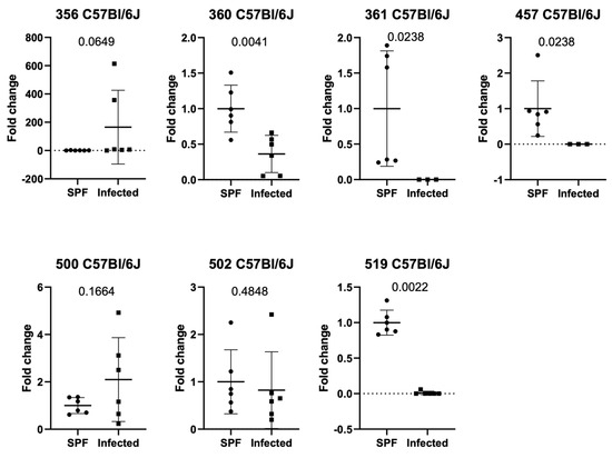 - Stehr, M.; Greweling, M.C.; Tischer, S.; Singh, M.; Blöcker, H.; Monner, D.A.; Müller, W. Charles River altered Schaedler flora (CRASF®) remained stable for four years in a mouse colony housed in individually ventilated cages. Lab. Anim. 2009, 43, 362–370. [Google Scholar] [CrossRef]