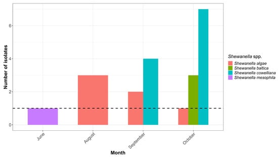 Number of Shewanella species isolates per month, with a dashed black line indicating the threshold (minimum value) of isolates. The plot highlights the monthly distribution and frequency of these species across the sampling period. July is excluded from the bar chart as no Shewanella isolates were detected.