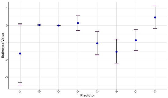 Based on the results and considering the variables involved, it was decided to proceed with Model 1 for further analysis. The non-parametric bootstrap analysis of Model 1 was performed to estimate the uncertainty of the coefficients in the logistic regression model with 1000 repetitions in order to obtain more robust estimates and calculate confidence intervals without making parametric assumptions (Figure 3). This approach allows for the consideration of data variability and provides a more reliable assessment of the coefficients, especially in the presence of uncertainty or poor statistical significance of the predictors in the logit model. Furthermore, the bootstrap allows for testing the stability of the estimates, identifying potential biases or large variations in the coefficients derived from the analysed samples. Therefore, this analysis complements the logit model, enhancing the robustness of the conclusions and increasing confidence in the obtained estimates.