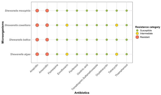 Shewanella cowelliana, S. baltica, S. algae, and S. mesophila are all resistant to ampicillin and amoxicillin. For the other antibiotics tested, sensitivity varies. Shewanella cowelliana and S. algae show intermediate resistance to enrofloxacin and tetracycline, while the other two species are sensitive. Furthermore, all species are sensitive to flumequine, florfenicol, oxolinic acid, trimethoprim/sulphamethoxazole, oxytetracycline, and thiamphenicol. Overall, resistance to the most commonly used classes of antibiotics is limited in these Shewanella species, except for ampicillin and amoxicillin.