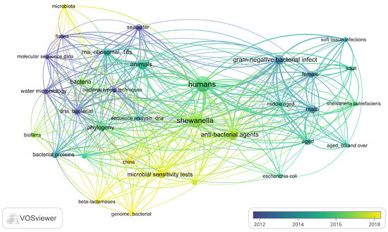 The network plot generated by VOSviewer highlights thematic clusters of keywords related to Shewanella research, illustrating the diverse areas of study, primarily focusing on S. algae and S. putrefaciens, species commonly associated with marine environments and human infections of varying severity (Figure 5). A central hub is formed around the keyword “Shewanella”, which connects various domains, reflecting its significance across multiple fields. The analysis reveals a strong focus on human health, with terms such as “humans”, “Gram-negative bacterial infections”, and “soft tissue infections” dominating one cluster, underscoring the clinical implications and pathogenic potential of Shewanella species, particularly S. putrefaciens. Another cluster emphasises environmental and ecological aspects, with keywords like “phylogeny”, “microbiota”, “biofilms”, and “water microbiology” pointing to the role of the genus in marine and aquatic environments. Additionally, molecular and antimicrobial studies are represented by terms such as “microbial sensitivity tests”, “beta-lactamases”, and “genome, bacterial”, reflecting research on resistance mechanisms and genomic characterisation. The overlap between clusters indicates interdisciplinary connections, particularly between environmental microbiology and human health, highlighting the broad relevance of Shewanella research.