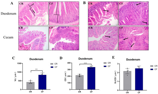 To explore the impact of feeding methods on the intestinal morphology of Lueyang black-bone chickens, histological sections were subjected to HE staining. The morphological characteristics of the duodenum and cecum (in micrometers) of the chickens are illustrated in Figure 1A,B. The findings indicate that the duodenal and cecal structures of Lueyang black-bone chickens in both the CR group and the CF group were intact and well defined, with no significant differences observed (Figure 1A). Compared to the CR group, the number of inflammatory cells in the CF group was increased, and the inflammatory infiltration was more obvious in the duodenum and cecum (indicated by black arrows in Figure 1B). Furthermore, by measuring the height of the intestinal villi (VH) and crypt depth (CD) and calculating the VH/CD ratio, it was found that the CF group exhibited a significant increase in both the VH and CD compared to the CR group (p < 0.01), but the VH/CD ratio did not show a significant change (Figure 1C,E). The above results suggest that the intestinal absorptive area in the CF group was enhanced, and the digestion and absorption of nutrients may have been stronger.