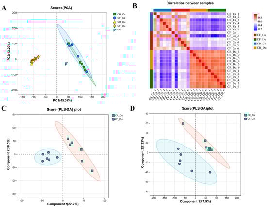 To investigate the factors contributing to variations in intestinal morphology associated with different rearing methods, a metabolomic analysis utilizing LC-MS detection technology was conducted. The results show that the QC samples in the PCA score plot are closely clustered around the coordinate origin, suggesting good experimental reproducibility. However, some cross-overlap was observed between the samples from the CR and CF groups in both the duodenum and cecum (Figure 2A). The sample correlation heatmap reveals distinct differences in metabolite profiles between the CR and CF groups (Figure 2B). PLS-DA demonstrated significant differences in the intestinal metabolites between the two groups in both the duodenum and cecum (Figure 2C,D). Quality control assessments confirmed that the different feeding methods influenced the intestinal metabolites of Lueyang black-bone chickens, thereby warranting further analysis of metabolite expression.