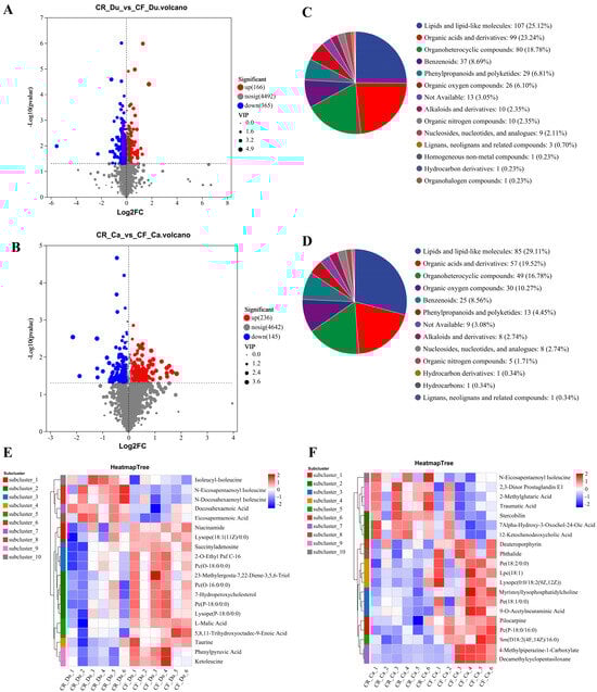 Screening and identification of differential metabolites under different rearing modes. (A) CR vs. CF volcano diagram in the duodenum; (B) CR vs. CF volcano diagram in the cecum; (C) classification of CR vs. CF DMs in the duodenum; (D) classification of CR vs. CF DMs in the cecum; (E) the 20 DMs in the duodenum; (F) the 20 DMs in the cecum.