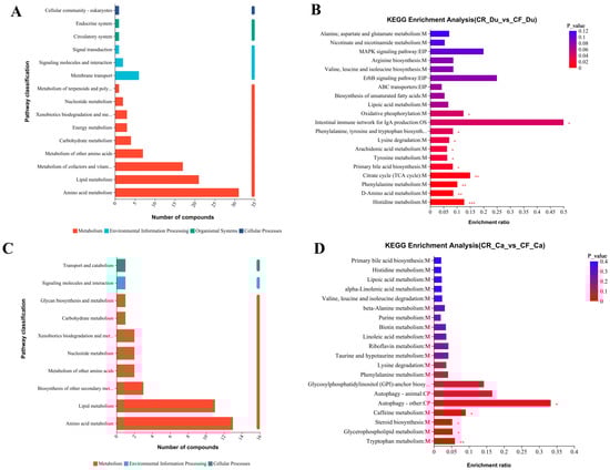 KEGG enrichment of DMs. (A) CR vs. CF DM functional pathways in the duodenum; (B) the enrichment of CR vs. CF DMs in the duodenum; (C) CR vs. CF DM functional pathways in the cecum; (D) the enrichment of CR vs. CF DMs in the cecum. * p < 0.05, ** p < 0.01, and *** p < 0.001.