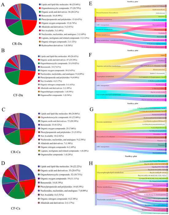 Analysis of unique metabolites under different rearing modes. (A,E) Classification and Sankey diagram of UMs from the CR group in the duodenum; (B,F) classification and Sankey diagram of UMs from the CF group in the duodenum; (C,G) classification and Sankey diagram of UMs from the CR group in the cecum; (D,H) Classification and Sankey diagram of UMs from the CF group in the cecum.