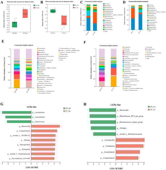 The richness, diversity, and coverage of species in the community can be obtained through the alpha diversity index analysis. The results show that in the duodenum and cecum, the data were more dispersed in the CF group than in the CR group. Specifically, the duodenum exhibited higher species richness and diversity in the CF group. Conversely, the cecum displayed greater species richness and diversity in the CR group (Figure 6A,B).