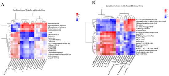 Correlations between gut differential metabolites and microorganisms under different rearing modes. (A) Correlation analysis in the duodenum; (B) correlation analysis in the cecum. * p < 0.05, ** p < 0.01, and *** p < 0.001.