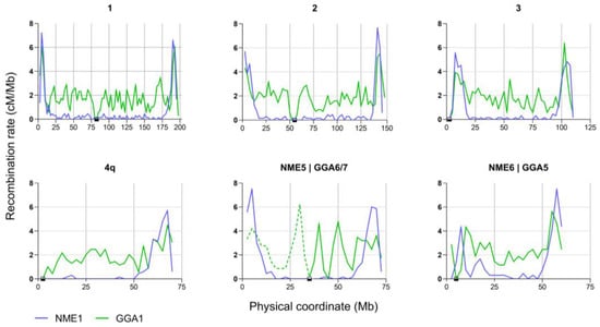 Recombination rates for each interval were obtained from the MLH1 focus counts in the six or seven largest macrobivalentes of both species. Focus frequencies were converted to centimorgans (cM) by multiplying the number of foci in each interval by 50 and then dividing by the total number of SCs observed. This genetic length divided by the interval size in Mb gives the recombination rate in cM/Mb for each interval [14,31,32]. Comparisons between species were carried out at the chromosome level, taking into account the sequence homology between these species as established by cytogenetic and genomic studies (Figure S1). The short arms of GGA4 and NME4 were formed by translocations of different microchromosomes in each lineage [30], so our comparisons were limited to the long arm.