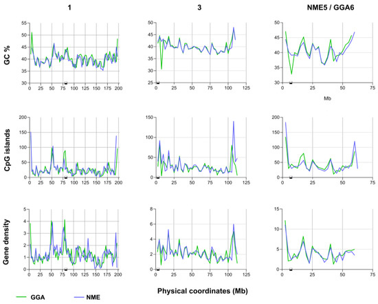 Genomic parameters densities in the chicken and the guinea fowl. The graphs show the percentage of GC content, numbers of CpG islands, and gene density in 2.5 Mb intervals along three representative macrochromosomes. The graphs for the other macrochromosomes can be found in the Supplementary Material Figures S2–S4. The squares on the X-axis mark the position of the centromeres.