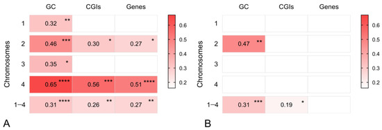 In order to formally quantify species-specific associations between the genomic parameters and recombination rates, we tested the correlations between each parameter distribution and the recombination rates, both per chromosome, and gathered data for chromosomes 1 to 4. In the guinea fowl, segments with no recombination were excluded from the analysis to avoid the effects of data zero inflation because there is hardly any variation in the recombination rate in the central regions of chromosomes. In the chicken, most genomic features showed significant positive correlations, even though the correlation coefficients were not large, with 0.65 for the most associated parameter (Figure 3A). In the guinea fowl, only GC content in chromosome 2 and GC and CGI showed positive correlations with recombination rates when data from all chromosomes were pooled (Figure 3B). Given that most parameters showed no correlation or low significance in this species (Table S2), we conclude that the few positive correlations reflect stochastic noise rather than biological signals. Altogether, these results indicate that the differences in the broad-scale recombination patterns in the chicken and the guinea are only weakly related to the genomic parameters investigated here.