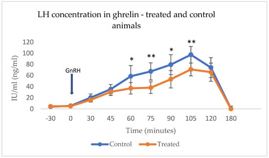 Preovulatory LH surge induced by GnRH administration in synchronized ghrelin-treated (n = 6) and control (n = 6) animals. Asterisks denote significant differences (* p < 0.05, ** p < 0.01).