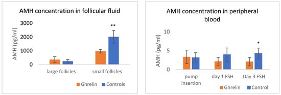 Antimullerian hormone (AMH) concentrations in the follicular fluid of large and small follicles and in the blood at times relative to the day of pump insertion (day 0) and along the 1st and 6th FSH administration in ghrelin-treated and control animals. Follicular fluid AMH concentrations were assayed in 10 animals from each group, while blood AMH levels were determined in 6 animals from each group. Asterisks denote significant differences (* p < 0.05, ** p = 0.0003).