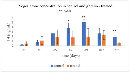 Progesterone concentrations in control (n = 6) and ghrelin-treated animals (n = 6) during the estrus cycle following prostaglandin administration. Asterisks denote significant differences (* p < 0.02, ** p < 0.006).