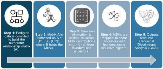 Figure 1. Flowchart of the MSV decomposition process for estimating ancestor contributions to inbreeding and coancestry, based on matrix factorization and recursive pedigree tracing.