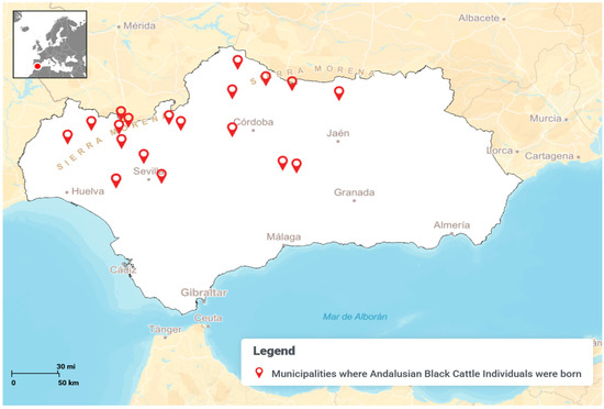 Figure 2. Map of Andalusia (Spain) depicting municipalities where Andalusian Black Cattle individuals were born.