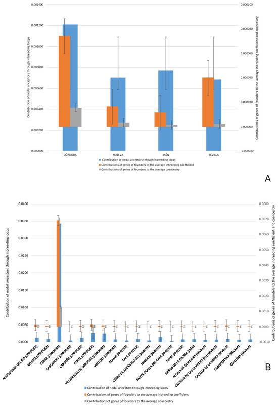 The Andalusian Black Cattle (Negra Andaluza) represents a genetic lineage linked to the ancient Eurasian aurochs, shaped by domestication events in the Near East and later introgressions from Italian and North African wild cattle. This study investigates the breed’s anthropological and historical origins, geographical distribution, and genetic structure. Key influences include historical use as draft animals, regional breeding preferences, and gene flow via transhumant routes. The genetic analysis reveals that Córdoba is the principal nucleus, accounting for 448 identified ancestors, compared to 252 in Huelva and 193 in Seville. In Córdoba, contributions of nodal ancestors through inbreeding loops reached a maximum of 0.0447, while mean inbreeding ( F ¯ ) was 0.000949 and mean coancestry ( C ¯ ) was 0.000475, indicating moderate but geographically structured genetic drift. In contrast, areas with better connectivity showed higher heterogeneity and lower inbreeding contributions. Canonical discriminant analysis (CDA) revealed that the first discriminant function (F1) explained 79.72% of the variation among groups, primarily driven by nodal ancestors and inbreeding loops. Despite these signs of inbreeding, historical transhumance has helped preserve overall genetic diversity. These findings offer essential insights for conservation programs aimed at maintaining both the genetic integrity and adaptive potential of this historically and culturally important breed.