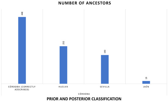 Figure 5. Prior and posterior classification of Cordobesian ancestors across the provinces where Andalusian Black Cattle were born, with Córdoba being the predominant birth province, therefore taken as a reference.