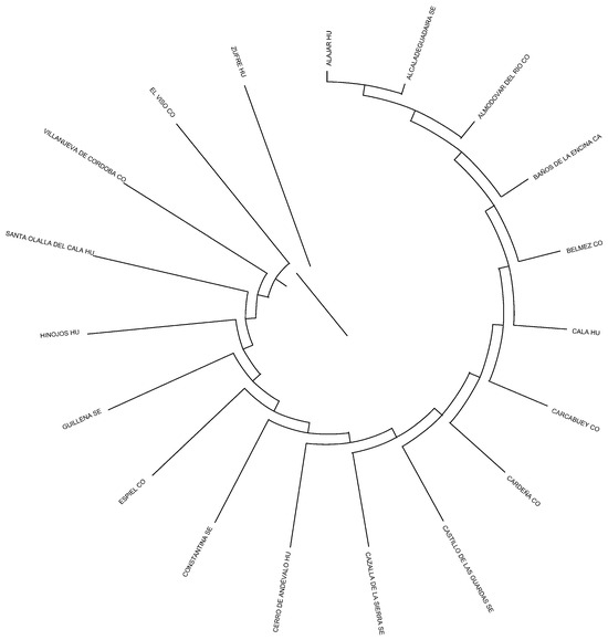 Figure 7. Mahalanobis distances dendrogram depicting relationship across municipalities and provinces (CO, Córdoba; HU, Huelva; SE, Sevilla) in the Andalusian Black Cattle Breed.
