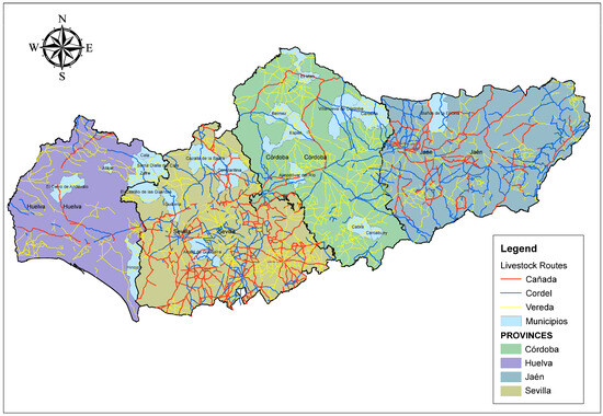 Figure 9. Livestock routes across the area of expansion of the Andalusian Black cattle breed.