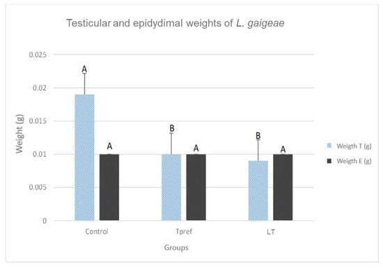 Weight (g) of testis and epididymis of L. gaigeae specimens with and without treatment at different temperatures. The bars indicate the distribution of the mean value of the data obtained from each treatment and region. Different letters indicate significant differences between the comparison of groups, according to the analysis of variance (ANOVA) and the Tukey post hoc test, given with a p-value < 0.05.