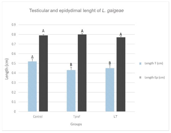 Testicular and epididymal lengths of L. gaigeae specimens with and without treatment at different temperatures. The bars indicate the distribution of the mean value of the data obtained from each treatment and region. Different letters indicate significant differences between the comparison of groups, according to the analysis of variance (ANOVA) and the Tukey and Kruskal–Wallis post hoc test, given with a p-value < 0.05.