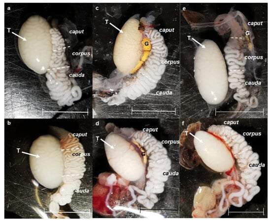 Physical variations in the testis and epididymis were found in some individuals of L. gaigeae subjected to different temperatures. Images (a,b) correspond to organs collected in the control group; images (c,d) correspond to organs collected in the preferred temperature treatment (Tpref); images (e,f) correspond to organs collected in the low temperature treatment (LT). G: Fat body. T: Testis. Bars at 0.5 mm.