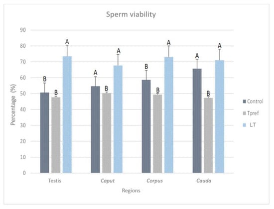 Firstly, it should be noted that the percentage of sperm viability in the control group and LT (21 °C) is above 60% at the cauda level. In this case, the percentage of viable spermatozoa in the control group ranges from 50.66% at the testicular level to 65.6% in the cauda.