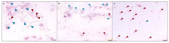 Representative photomicrographs of sperm viability of L. gaigeae with and without treatment at different temperatures stained with eosin–nigrosin for viability assessment with the plasma membrane dye penetration method, obtained by brightfield microscopy. (a): Control group; (b): LT group; (c): Tpref group. Blue arrowheads: viable sperm; red arrowheads, non-viable sperm. ×100 Bars corresponding to 10 µm.