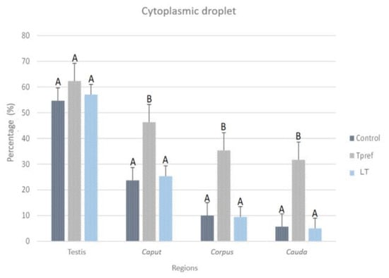 Percentage of spermatozoa with cytoplasmic droplet (CD) of L. gaigeae with and without treatment at different temperatures. The bars indicate the distribution of the mean value of the data obtained from each treatment and region. Evidence of CD removal at the testicular level is shown in the control group and with low temperature treatment (21 °C). All groups showed a decrease in CD as they moved to the caput zone, with a difference in the percentage of spermatozoa found with this characteristic. Different letters indicate significant differences between the comparison of groups, according to the analysis of variance (ANOVA) and Tukey’s post hoc test, given with a p-value < 0.05.