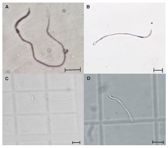 Representative photomicrographs of L. gaigeae spermatozoa stained with eosin–nigrosin (A,B) and unstained (C,D) for evaluation of the presence of cytoplasmic droplet (CD) by brightfield microscopy. (A,C): Spermatozoa with CD. (B,D): Spermatozoa without CD. ×400. Bars indicate the dimensions of the photomicrographs, corresponding to 10 µm.
