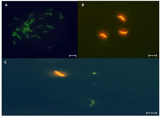 Representative photomicrographs of L. gaigeae spermatozoa stained with acridine orange for DNA integrity evaluation by fluorescence microscopy. (A): Spermatozoa with intact DNA. (B): Spermatozoa with fragmented DNA. (C): Indicates the bipolarity of the staining found in the cell samples. ×400. Bars at 10 µm.