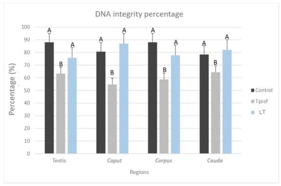 On the contrary, the group treated at Tpref (24 °C) exhibits a lower percentage of spermatozoa with intact DNA from the testicular level (63.3%), whereas in caput presents its lowest percentage value (54.6%) which subsequently increases in the corpus and cauda (58.6% and 64.3%, respectively). This finding contrasts directly with the LT group (21 °C), whose case is similar to that found in the control group, with its percentage in the caudal region even higher than in the last mentioned (82%).