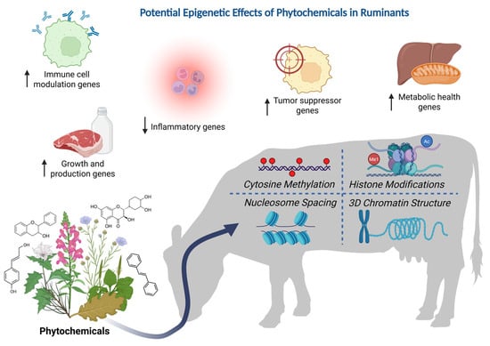 Research on the epigenetic mechanisms that underlie the medicinal effects of phytochemicals has largely been conducted in the context of human health. While little research has examined the epigenetic effects of phytochemicals in livestock diets, it is reasonable to assume that similar processes to those already identified in humans also occur within other animals. Such processes include the epigenetic regulation of immune response, inflammation, tumorigenesis, and metabolic health, as well as growth rates (Figure 2).