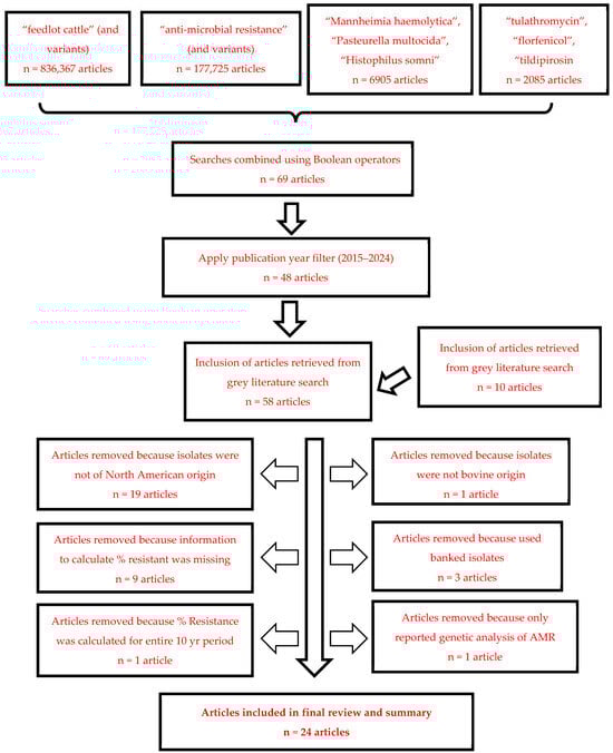 The search itself was conducted systematically in multiple stages. An initial search for “feedlot cattle” and all variations in the term yielded 836,367 results. A subsequent search for “anti-microbial resistance”, and similar terms produced 177,725 articles. This was followed by a search for bacterial species of interest, which resulted in 6905 articles, and finally, a search for the specific drugs, yielding 2085 articles. These searches were then combined, using Boolean operators to integrate the cattle, bacteria, anti-microbial resistance, and drug parameters into a single query. This step refined the results to 69 articles. Adding a publication year filter (2015–2024) further narrowed the results to 48 articles. An additional 10 articles were retrieved from the “grey” literature for a total of 58 articles relevant to assessing temporal changes in AMR in BRD pathogens. Search strategy results are depicted in Figure 1.