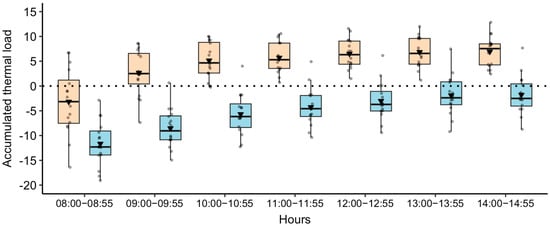 Boxplot of accumulated thermal load values over the hours of evaluation. Positive values indicate heat gain from the environment and negative values indicate heat loss to the environment, under shaded (blue box) and sunny (peach box) conditions. The black triangle represents the mean, while the solid black line represents the median. The box limits correspond to the 25th and 75th percentiles (first and third quartiles). Gray points represent individual observations, jittered using the ‘geom_jitter’ function [36].
