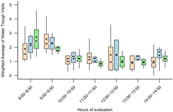 Boxplot of weighted average of number of water trough visits of different social categories (dominant: peach box, intermediate: blue box and subordinate: green box) throughout the hours of evaluation. The black triangle represents the mean, while the solid black line represents the median. The box limits correspond to the 25th and 75th percentiles (first and third quartiles).