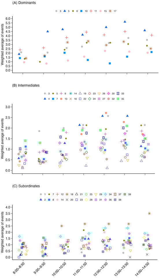 Individual weighted average of events of use of the shaded areas by social category (A) dominants, (B) intermediates, and (C) subordinates) throughout the hours of evaluation. Each cow is represented by a symbol and color. Symbols were jittered using the ‘geom_jitter’ function [36].
