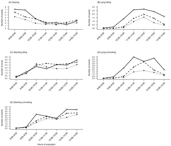 Weighted average of number of events by behaviors (A) grazing, (B) lying idling, (C) standing idling, (D) lying ruminating, and (E) standing ruminating in the shaded areas by social category (dominant, intermediate and subordinate) throughout the hours of evaluation. The solid lines with white circles represent dominant cows, dashed lines with black circles represent intermediate cows, while dotted lines with triangles represent subordinate cows.